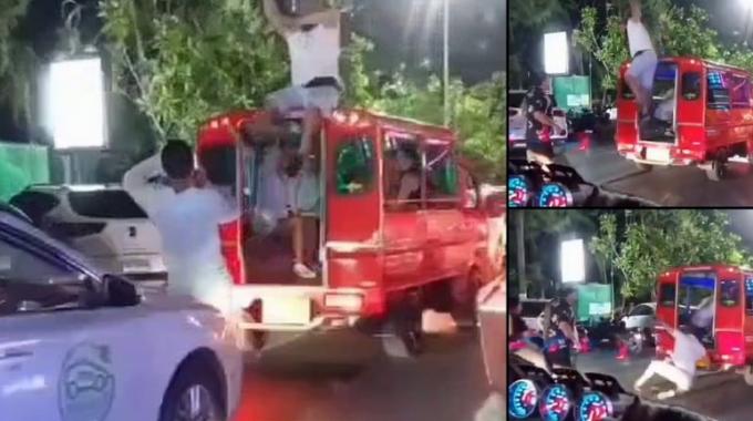 Dans la vidéo, on voit un individu assis sur le toit d’un tuk-tuk pendant que deux autres personnes le suivent dans un autre véhicule et filment la scène. L’individu sur le toit du tuk-tuk fait des gestes puis saute du véhicule, tombe sur la route, et remonte rapidement dans le tuk-tuk.