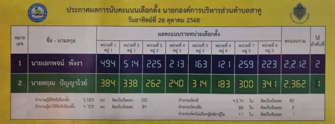 Selon les résultats officiels M. Trin, représentant le parti Love Sakhu, a obtenu 2,362 voix, tandis que M. Ekaphon en a obtenu 2,212. 47 personnes se sont abstenues et 88 bulletins étaient invalides.