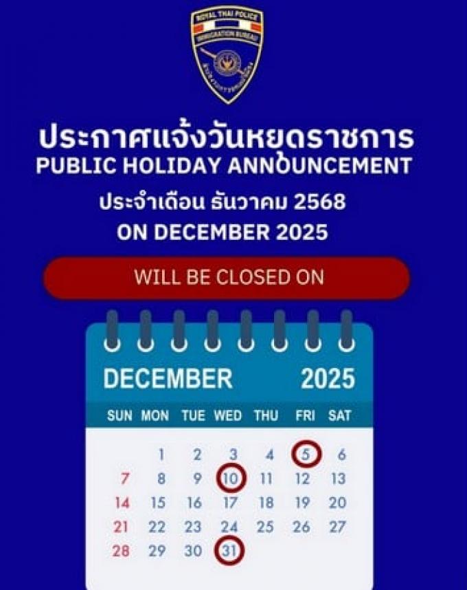 PHUKET : Le Bureau de l’Immigration de Phuket, et tous les autres services du gouvernement à Phuket, seront fermé pendant trois jours fériés; le 5 Décembre, le 10 Décembre et le 31 Décembre, chacun marquant un évènement important de l’histoire, de la culture et des traditions thaïes. Les services réouvriront normalement dès les lendemains des jours fériés.