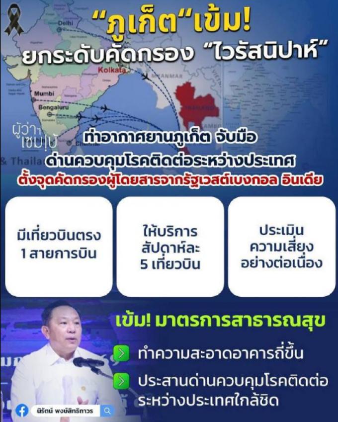 Le gouverneur de Phuket Nirat Pongsitthaworn a confirmé que la province surveillait de près la situation en coopération avec le Contrôle International des maladies Infectieuses, notamment pour les passagers en provenance du Bengal occidental.