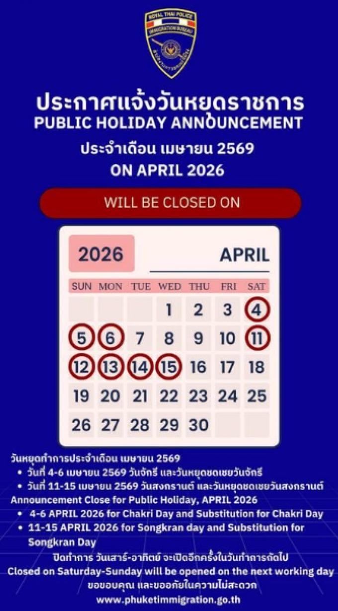 PHUKET : Les services du gouvernement à Phuket, y compris le Bureau de L’immigration de Phuket, seront fermés plusieurs jours en Avril à l’occasion des fêtes publiques, et réouvriront le lendemain de chaque fermeture.