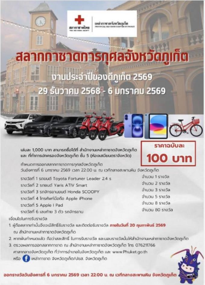 PHUKET : Les billets de la loterie annuelle de la Croix Rouge de Phuket sont en vente avant le début de la Foire de la Croix Rouge et les festivités du Nouvel An à Saphan Hin du 29 Décembre 2025 au 6 Janvier 2026.