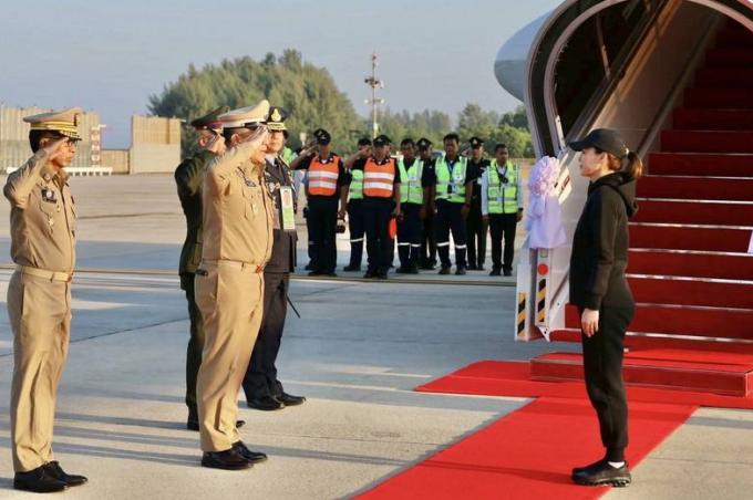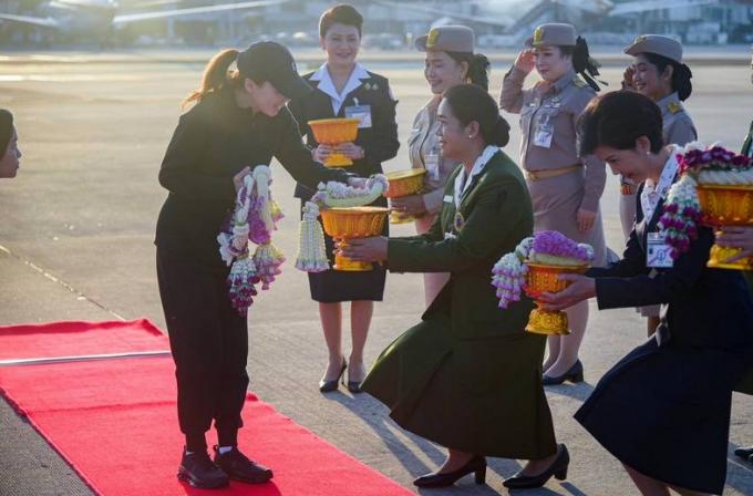 Sa Majesté la Reine Suthida Bajrasudhabimalalakshana a atterri à l’Aéroport International de Phuket à 6h50, où elle a été officiellement accueillie par des officiels de l’armée, de la police et de la province.