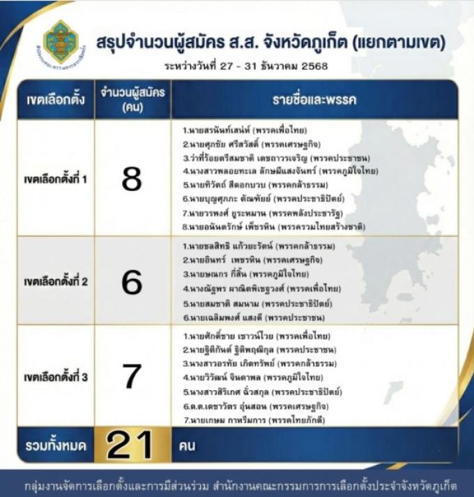 Orapin Achivasuk, directrice du Bureau Provincial de la Commission Électorale de Thaïlande à Phuket (PEC Phuket), a indiqué que tous les candidats répondaient aux contrôles initiaux d’éligibilité.