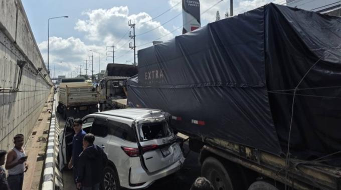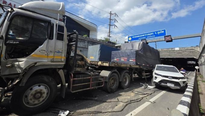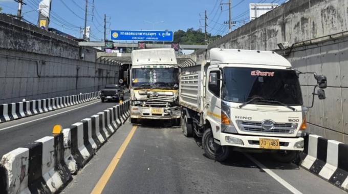 PHUKET : La circulation dans le Tunnel Darasamut a été bloquée hier après-midi après une collision entre un poids lourd, un camion et un pickup Toyota Fortuner, faisant deux blessés.