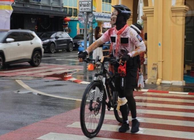 PHUKET : Au milieu de l’atmosphère festive d’Halloween, la Police Touristique de Phuket a ajouté une touche effrayante dans les rues de Old Town, avec un maquillage fantomatique et des masques pendant les patrouilles à vélo.