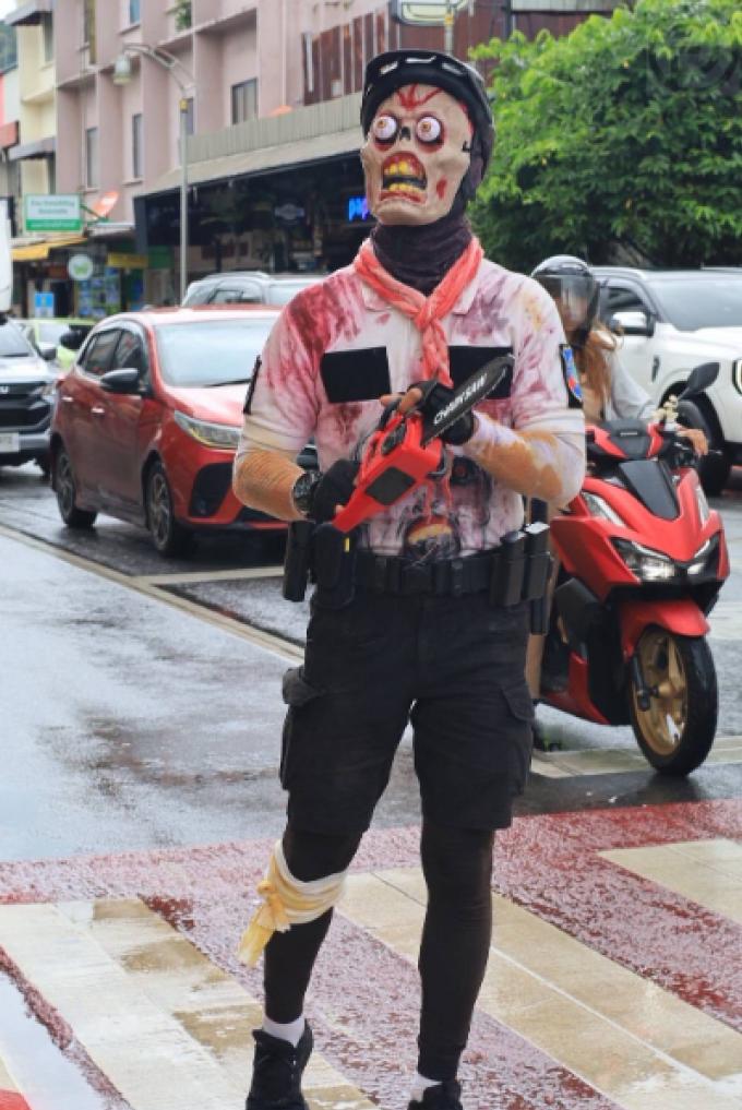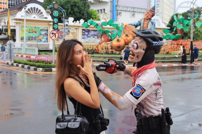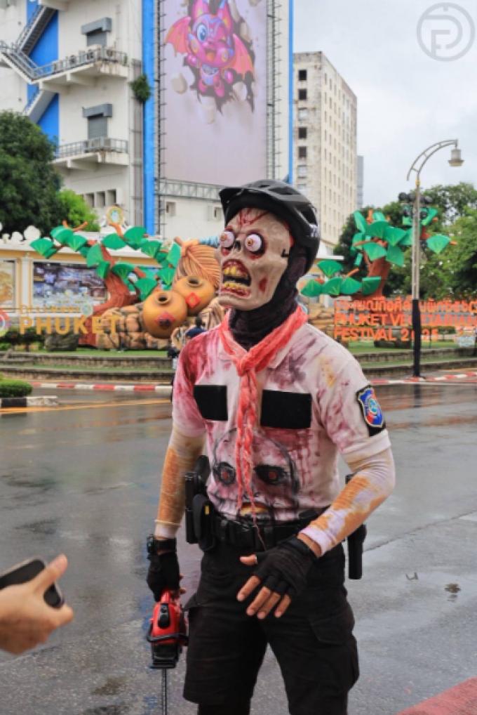 Les officiers portaient leurs uniformes habituels avec quelques améliorations sinistres, des visages maquillés et des masques effrayants, pour circuler dans les zones touristiques de la ville, notamment sur Thalang Rd, Phang Nga Rd, et à la célèbre intersection de la Chartered Bank intersection. Ces sites connus pour leur architecture sino-portugaise et leur animation sont devenus les lieux de photos impromptues et de rencontres amusantes.