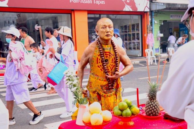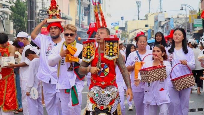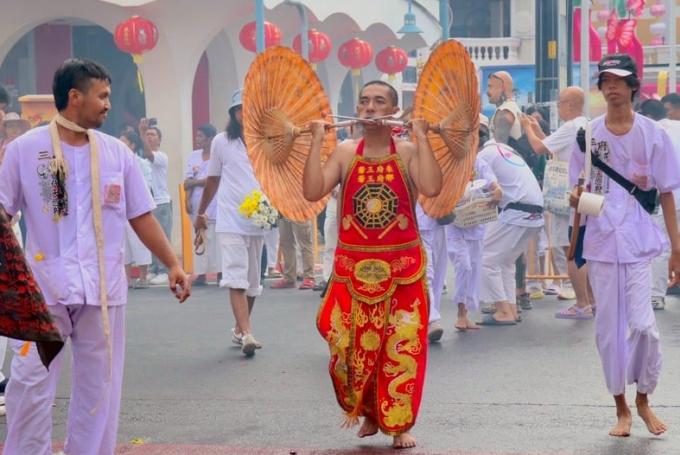Cette procession est connue pour être l’une des plus grandes du festival. Les médiums, possédés par les dieux, avaient les joues, les langues et le corps percés de divers objets, épées, parasols, lances,et des ‘mandala’ symboliques représentant le visage de Bouddha.