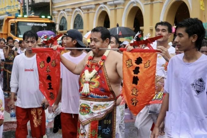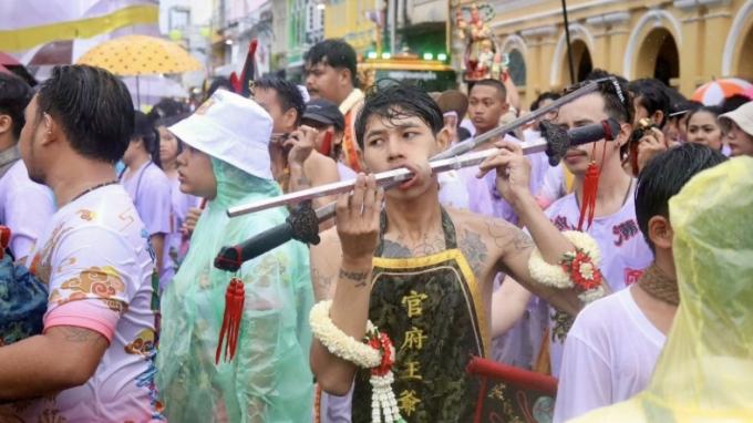 Les processions du matin ont commencé avec le Temple Jeng Ong, situé en face de l’Hôpital Vachira, où les médiums sont entrés en transe et ont pratiqué des actes de dévotion étonnants. Beaucoup avaient les joues et le corps percés d’épées, de couteaux et d’objets tranchants, symbolisant leur foi et leur résistance.