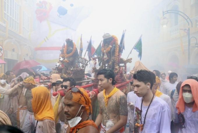 La procession de Tha Ruea a débuté près de l’Université Rajabhat, et à descendu Thepkasattri Rd jusqu’au centre ville pour rejoindre Saphan Hin, où les cérémonies se tiennent pendant les neuf jours du festival.