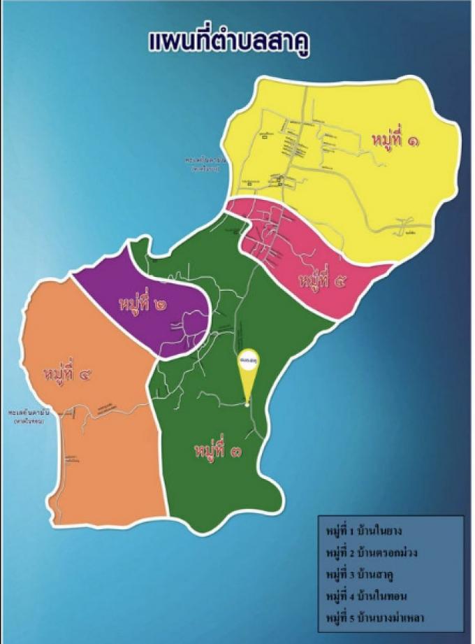 Sakhu comprend cinq localités, Baan Nai Yang, Baan Trok Muang, Baan Sakhu, Baan Nai Thon et Baan Bang Ma Lao.