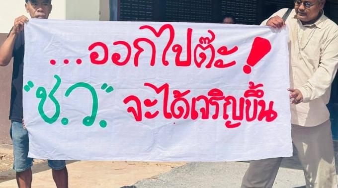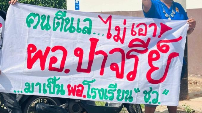 Les manifestants brandissaient des pancartes avec des slogans comme ‘Dehors! Ce Sera Mieux pour les Enfants!’, ‘Directrice Pajaree, Enfin Devenue un Administratrice de l’École’, et ‘Nous Ne Voulons Pas De Vous’.