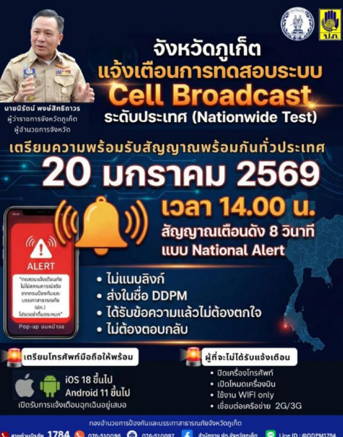 PHUKET : Les officiels de Phuket ont appelé le public à ne pas paniquer alors que le Département de Prévention et de Lutte Contre les Catastrophes de Thaïlande (DDPM) procède à des tests nationaux de son système d’alerte cellulaire.