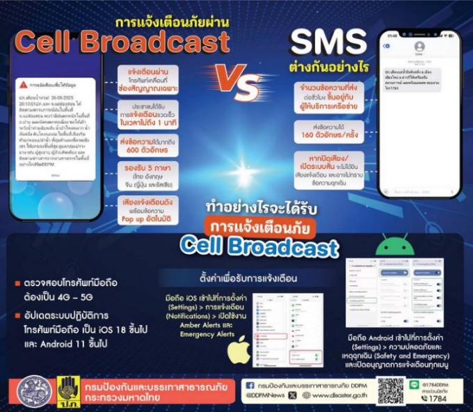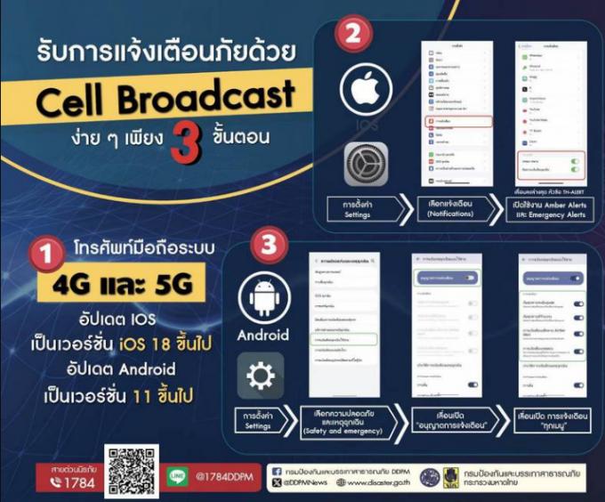 Selon le DDPM, le test a été réalisé par le Centre National d’Alerte Catastrophe en coopération avec la Commission Nationale de Diffusion et de Télécommunications (NBTC) et les opérateurs mobiles. L’alerte a été envoyée simultanément à tous les téléphones compatibles au réseau ‘Cell Broadcast’.