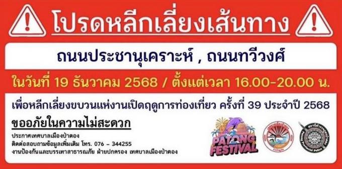Dans son communiqué, la Municipalité de Patong présente ses excuses pour la gêne occasionnée par la parade et appelle les conducteurs à prévoir des trajets alternatifs pendant les horaires de la parade.