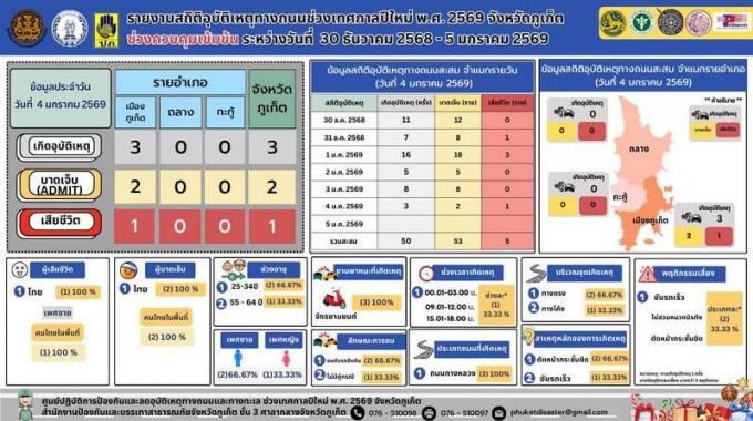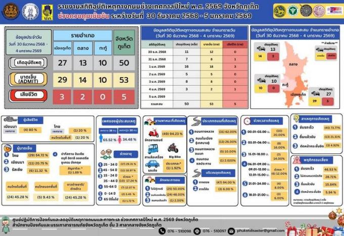 Le DDPM Phuket a indiqué qu’entre le 30 Décembre et le 4 Janvier la province avait enregistré 50 accidents, faisant 53 blessés hospitalisés et cinq morts.