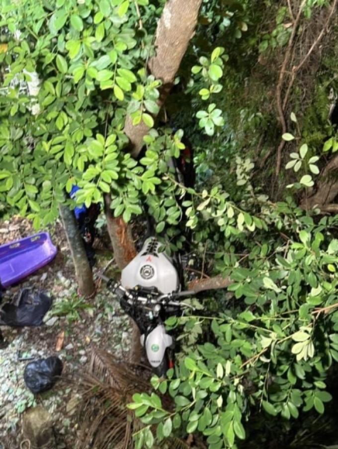 La moto, restée bloquée dans un arbre, a été récupérée et remorquée au poste de police de Patong.