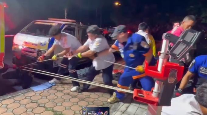 Les secouristes ont installé des cordes pour faire descendre une civière dans le ravin. Malgré la pente, ils sont parvenus a faire remonter M. Vasiliy sur la route et l’ont transporté à l’Hôpital de Patong pour le soigner.