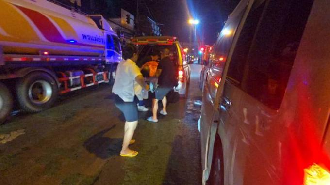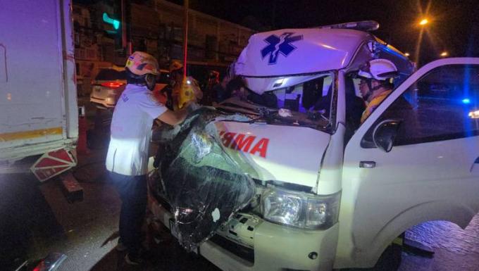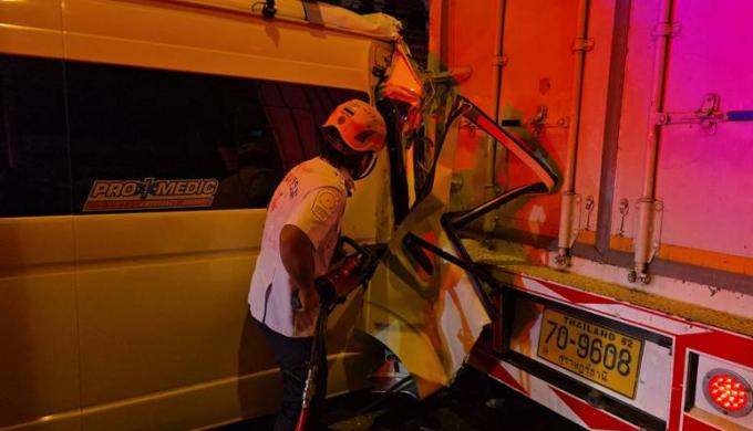 Sur place, les officiers ont trouvé une ambulance privée de Bangkok accidentée à l’avant après avoir percuté l’arrière d’un camion.