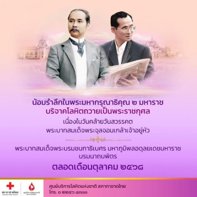 La Croix Rouge de Thaïlande et le PRBC ont annoncé que la campagne d’Octobre était dédiée à la commémoration du Roi Chulalongkorn (Rama V) et du Roi Bhumibol Adulyadej (Rama IX), dont les charges royales ont apporté des bienfaits incommensurables au peuple thaï.