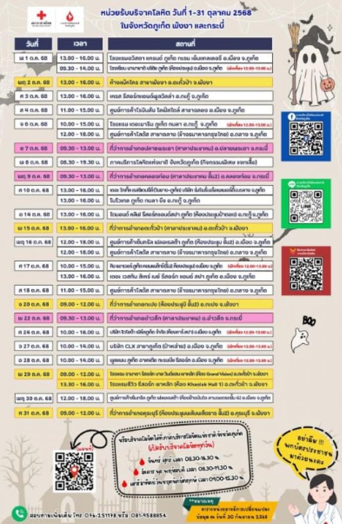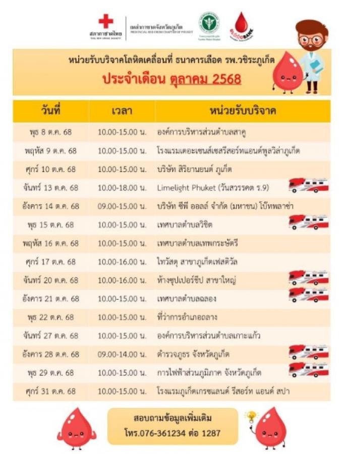 PHUKET : Le Centre Régional du Sang de Phuket (PRBC) a annoncé le programme de sa campagne d’Octobre 2025 à Phuket, Phang Nga et Krabi, et apple les habitants de Phuket à donner leur sang en Octobre en l’honneur de deux des monarques les plus révérés de Thaïlande, et pour célébrer la Journée Nationale de la Thaïlande.